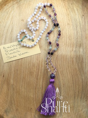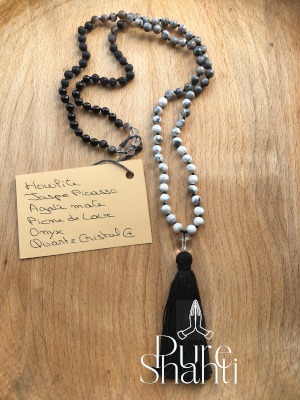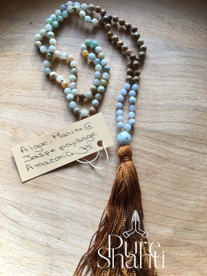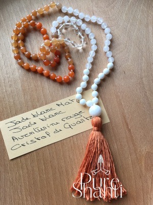 Vous trouvez des mālās à vendre en ligne sur de nombreux sites. Sachez que j’en fabrique aussi, avec beaucoup de soin et de conscience… Mes mālās sont en pierres semi-précieuses*, vous pouvez donc les porter en collier pour les vertus de leurs pierres, ou bien les utiliser pour méditer. Je les noue entièrement à la main, et il me faut à peu près deux heures (et quelques ampoules !) pour confectionner chaque pièce – qui est unique il va sans dire, je ne refais jamais deux fois exactement le même mālā… N’hésitez pas à me contacter si vous souhaitez voir ceux que j’ai « en stock » actuellement.