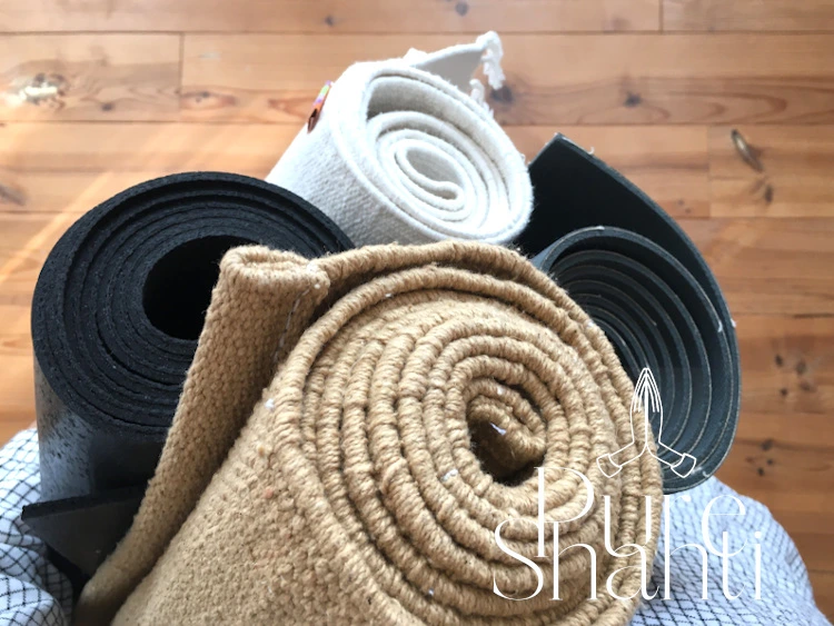 Maintenant, je ne vous cache pas que je n’étais pas entièrement satisfaite et que j’avais malgré tout envie d’une option 100% naturelle et traditionnelle (sans aller quand même jusqu’à la peau de daim…). Comme je vous l’ai dit, je ne pratique sur des tapis synthétiques que depuis mon retour d’Inde, avant quoi je faisais sur ce que j’avais, sans véritablement me poser de question (il faut dire d’ailleurs qu’il n’y avait pas d’offre à l’époque, les premiers tapis antidérapants étant arrivés dans les années 80, avec une certaine Angela Farmer qui commença à utiliser de la sous-couche de moquette sous ses appuis). Lorsque qu’ensuite j’ai vécu en Inde, nous pratiquions collectivement sur d’immenses tapis de coton posés à même la terre battue, par-dessus lesquels chacun installait (ou pas) son tapis personnel. Le mien était en coton, très très fin, plus un drap d’ailleurs qu’un véritable tapis, et je voulais pouvoir revenir, au moins de temps en temps, à ce contact naturel. À ce lien avec la terre qui est tellement essentiel voire guérisseur pour le corps…